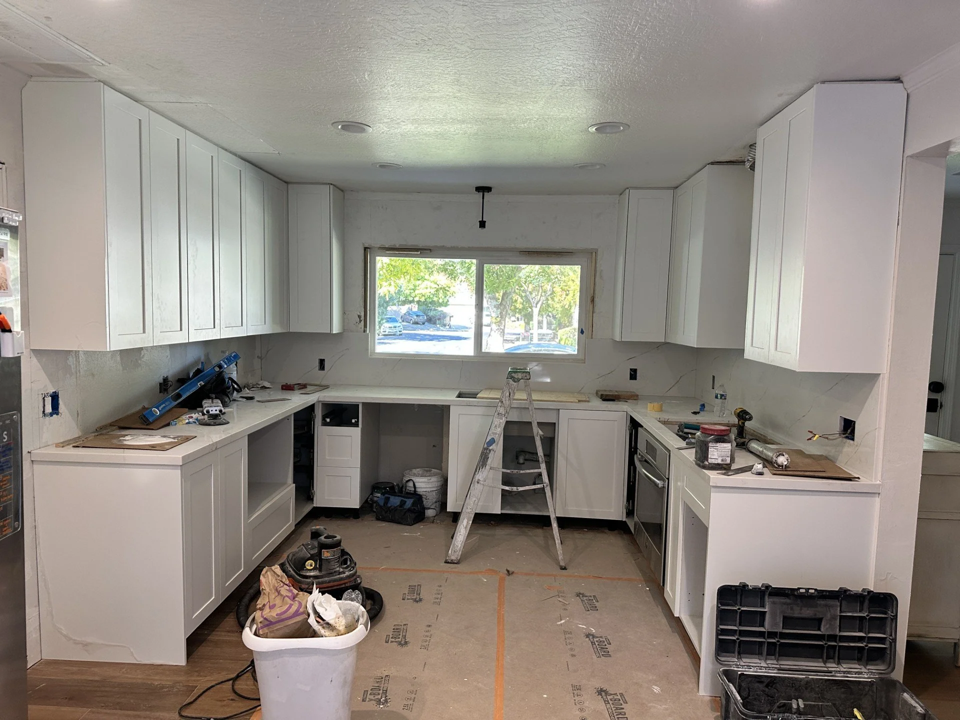 Shaker white cabinets, calcutta gold counters, build in appliances and cooktop, new 36” sink with a new window and undercabinet lights.