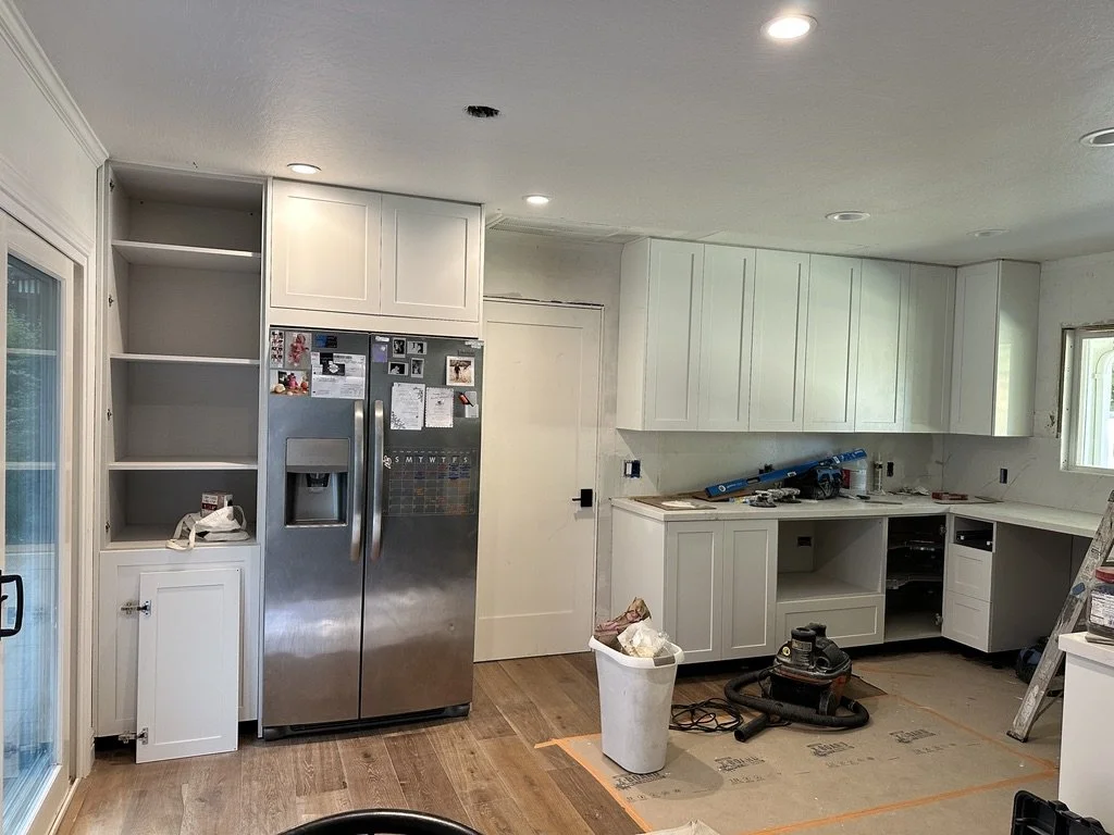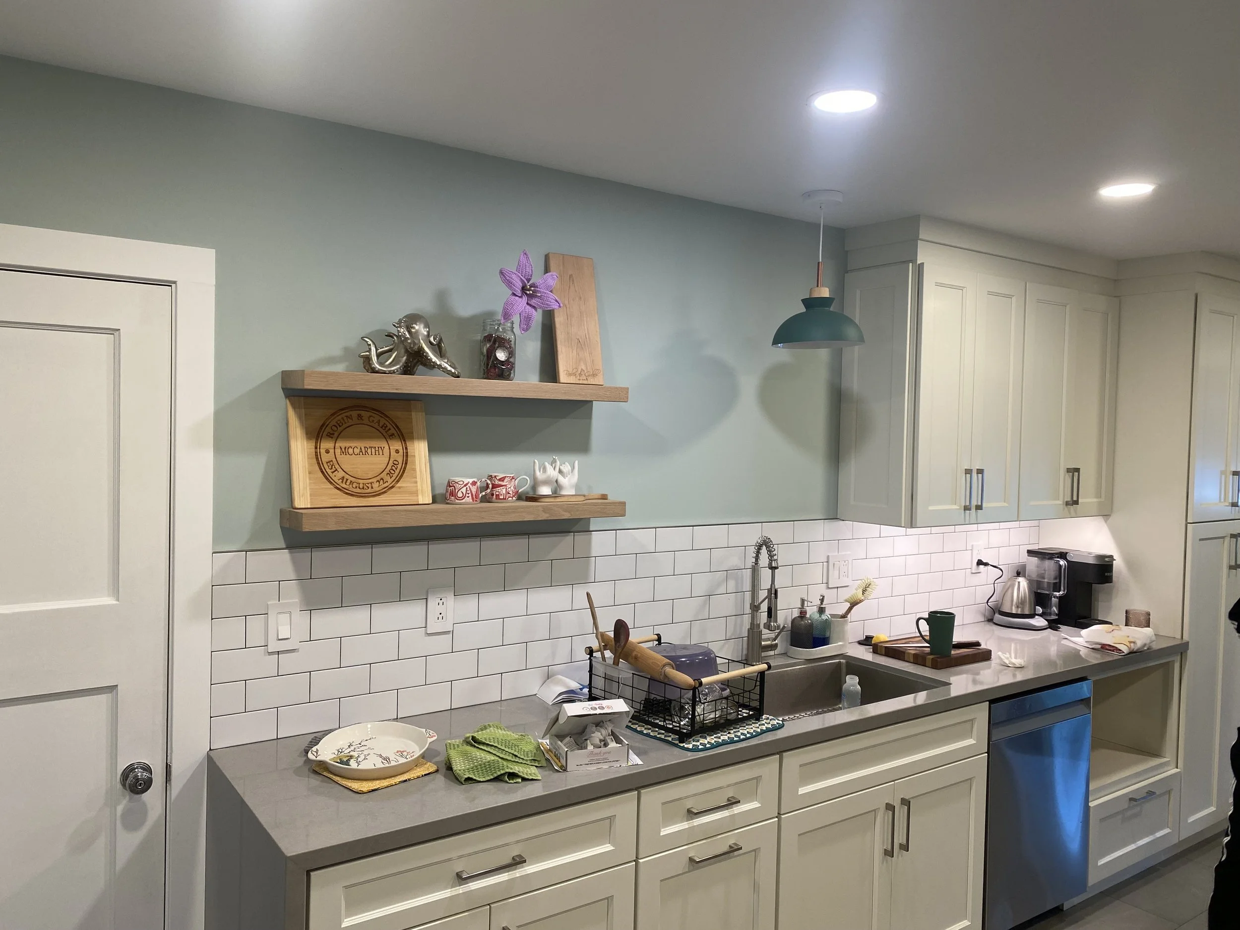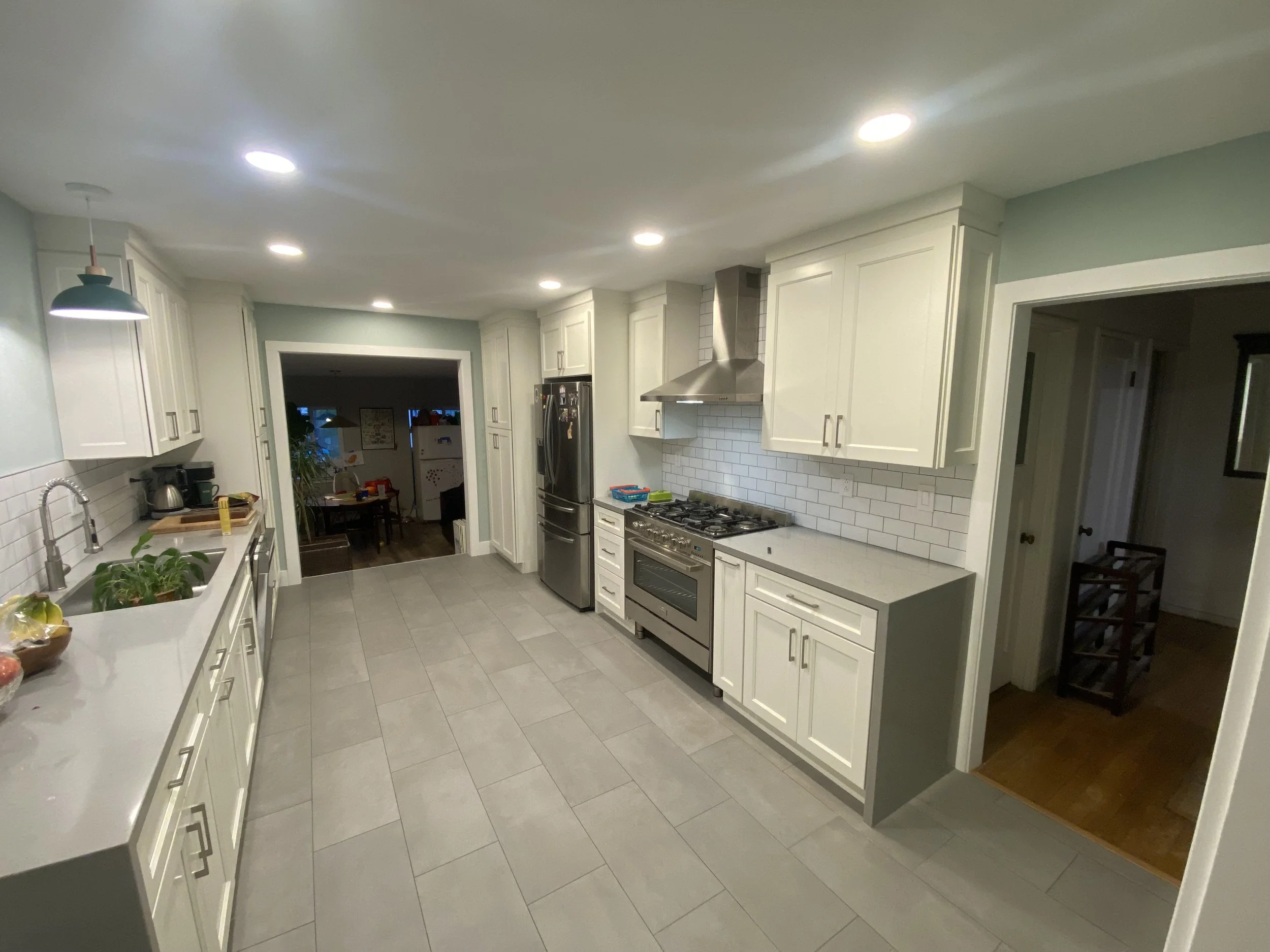 Drew new plans, pulled permits, and demo of existing kitchen, flooring, and walls. After the demo, all new drywall to replace the previous plaster walls. Painted a mint green to contrast with the all-white and gray look for a homey feel. The family selected tile flooring and Calcutta counters to prevent stains from two toddler boys—a clean, fast-paced, under-budget project. Happy family.